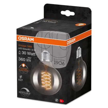 La Osram Vintage 1906 LED E27 Globe Filament Smokey 80mm 7.8W 360lm - 818 Extra Warm White | Dimmable è la perfetta sostituzione per la tua lampada convenzionale 30W con attacco E27 grazie alla sua tecnologia LED. Passare a LED ti offrirà tanti vantaggi!