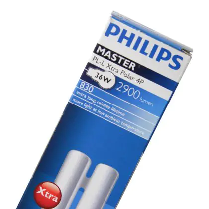 Le Philips PL-L Xtra Polar 36W 830 4P (MASTER) sono lampade fluorescenti compatte davvero efficienti, studiate e prodotte per funzionare con basse temperature. Queste lampade fluorescenti a basso consumo sono un'ottima scelta in termini di rispetto dell'ambiente in quanto hanno una lunga vita pari a 36.000 ore (praticamente doppia rispetto le corrispondenti lampade della categoria Philips PL-L Polar classica). L'attacco di queste lampade é del tipo 2G11 ed é dotato di 4 pin (perni). La potenza di tali lampade é di 36W.