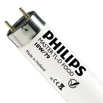 I Philips TL-D Food 18W 79 - 59cm (MASTER) sono tubi fluorescenti dotati di una potenza di 18W e di attacco G13 che presentano una lunghezza pari a 59cm. I tubi fluorescenti in questione data la temperatura di colore di 3800K e l'indice di resa cromatica tra 70-79Ra sono la soluzione ideale per l'illuminazione di prodotti alimentari quali carne e prodotti da panetteria.