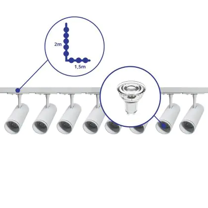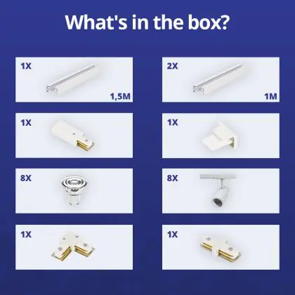 | Nome del fabbricante | Complete L shaped 1-Phase Track Set White incl. 8x Spot fixture + GU10 2700K 3W Dim – 1,5 x 2 meter | |