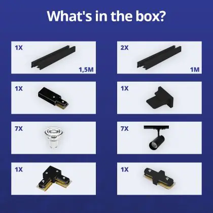 Descrizione Set completo 1-Fase Rail L 1,5 x 2 Metro Nero | incl. 7x Faretti + GU10 2700K 3W Dimmerabile + Tappo Di Chiusura, Connettore di Alimentazione e L -Connettore